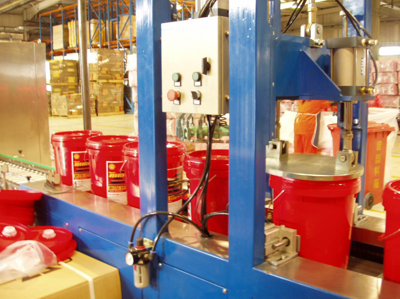 XGJ-1型全自动压盖机是由上海佳诚公司改进的一种新型压盖机。该机外形美观大方、灵巧、合格率高等特点。可适用于食品、制药、日化、农药、化妆品等行业的铁罐压盖。设备用于供盖、夹桶、传送、锁盖,机器自动化程度高,稳定性好,调节方便。