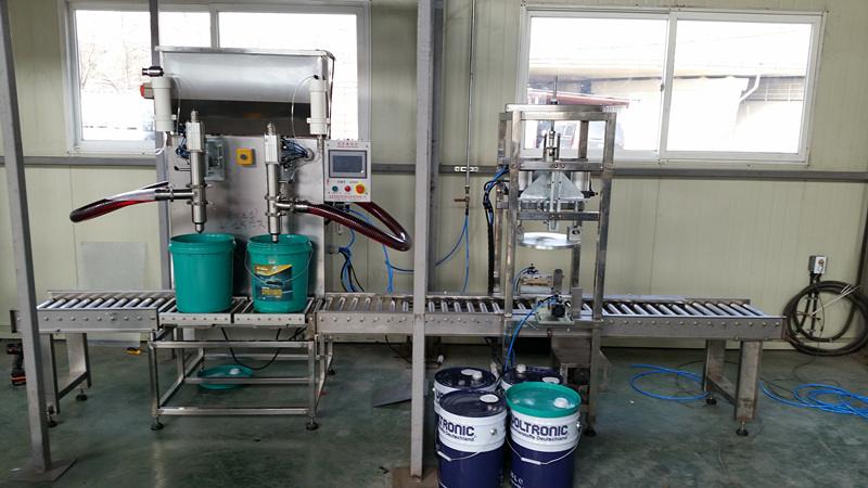 灌装好的桶,人工将桶输送到压盖位置,档块档住桶,使桶定在压盖位,压盖头由脚踏控制开关作用下,压盖头下降,使盖对准桶口,在气缸的左右偏向压力作用下,盖子顺利压到桶口上,压盖头自动上升,并将桶移出压盖位,档块自动打开,压好盖的桶输送支出,进入下一个工序。完成一次工序,下一桶又推入压盖位,重复一次工作。