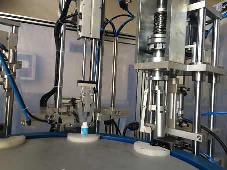 Conveyor transfer bottle to filling station, automatic filling, after filling, then transfer filled bottle to capping position , automatic load cap on bottle, automatic lock sealing cap on bottle, release bottle, then bottle will be exit from turntable.